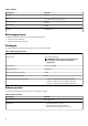 Tabel 5. Externe poorten (vervolg) Beschrijving Waarden Audiopoort Eén headsetpoort (gecombineerde poort voor hoofdtelefoon en microfoon) Videopoort • • • Mediakaartlezer Eén sleuf voor microSD-kaart Dockingpoort Eén externe grafische displaypoort OPMERKING: Deze externe grafische displaypoort is compatibel met de Alienware grafische versterker. Voedingsadapterpoort Eén E4-gelijkspanningsingang van 7,4 mm x 5,1 mm Beveiliging Slot voor één beveiligingskabel (klem) 1 HDMI 2.