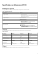 Tabel 8. Specificaties van de draadloze module (vervolg) Omschrijving Waarden Ondersteunde frequentiebanden 2,4 GHz / 5 GHz Draadloze standaarden • • • • WiFi 802.11a/b/g Wi-Fi 4 (WiFi 802.11n) Wi-Fi 5 (WiFi 802.11ac) Wi-Fi 6 (WiFi 802.11ax) Versleuteling • • • 64-bits/128-bits WEP AES-CCMP TKIP Bluetooth Bluetooth 5 Audio De volgende tabel bevat de audiospecificaties van uw Alienware m15 R3. Tabel 9.