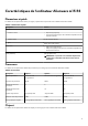 Tableau 5. Ports externes (suite) Description Valeurs Port vidéo • • • Lecteur de carte multimédia Logement de carte microSD Port d’accueil Un port graphique externe REMARQUE : Ce port graphique externe est compatible avec l’amplificateur graphique Alienware. Port de l’adaptateur d’alimentation Un DC-in E4 de 7,4 mm x 5,1 mm Sécurité Un logement pour câble de sécurité (en coin) Un port HDMI 2.0 Un port mini DisplayPort 1.4 Un port Thunderbolt 3 (USB 3.
