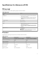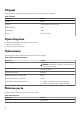 Tabel 8. Trådløse modulspecifikationer Beskrivelse Værdier Understøttede frekvensbånd 2,4 GHz/5 GHz Trådløse standarder ● ● ● ● Kryptering ● 64-bit/128-bit WEP ● AES-CCMP ● TKIP Bluetooth Bluetooth 5.1 WiFi 802.11a/b/g Wi-Fi 4 (WiFi 802.11n) Wi-Fi 5 (WiFi 802.11ac) Wi-Fi 6 (WiFi 802.11ax) Audio (Lyd) Følgende tabel viser lydspecifikationerne til din Alienware m15 R4. Tabel 9.