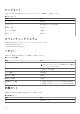 表 8. ワイヤレス モジュールの仕様 説明 値 転送レート 最大 2400 Mbps サポートされている周波数帯域 2.4 GHz/5 GHz ワイヤレス規格 ● ● ● ● 暗号化 ● 64 ビット/128 ビット WEP ● AES-CCMP ● TKIP Bluetooth Bluetooth 5.1 WiFi 802.11a/b/g Wi-Fi 4(WiFi 802.11n) Wi-Fi 5(WiFi 802.11ac) Wi-Fi 6(WiFi 802.11ax) オーディオ 次の表では、Alienware m15 R4 のオーディオの仕様をリスト表示しています。 表 9. オーディオの仕様 説明 値 オーディオコントローラー Realtek ALC3281-CG ステレオ変換 対応 内蔵オーディオ インターフェイス ハイ デフィニッション オーディオ インターフェイス 外付けオーディオ インターフェイス ● 1 x ヘッドセット(ヘッドホンとマイクロフォンのコンボ) ポート ● HDMI 2.