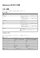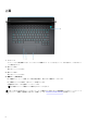 表 16. バッテリーの仕様 値 説明 バッテリーの充電時間(概算) 3 時間(PC の電源がオフになっている場合) メモ: Dell Power Manager のアプリケーションを使用して、 充電時間、期間、開始および終了時刻などを制御します。 Dell Power Manager の詳細については、www.dell.com/jajp で『私と My Dell』を参照してください。 コイン型電池 非対応 ディスプレイ 次の表では、Alienware m15 R4 のディスプレイの仕様がリスト表示されています。 表 17. ディスプレイの仕様 説明 オプション 1 オプション 2 オプション 3 ディスプレイタイプ 15.6 インチ フル ハイ デフィ ニション(FHD) 15.6 インチ フル ハイ デフィニ 15.6 インチ ウルトラ ハイ デ ション(FHD) フィニション(UHD) ディスプレイパネルのテクノ ロジー 広視野角(WVA) 広視野角(WVA) 有機発光ダイオード(OLED) 高さ 193.59 mm(7.62 インチ) 193.59 mm(7.