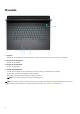 Vyer av Alienware m15 R4 Höger 1. microSD-kortplats Läser från och skriver till microSD-kortet. Datorn stöder följande korttyper: ● Micro Secure Digital (mSD) ● Micro Secure Digital High Capacity (mSDHC) ● Micro Secure Digital Extended Capacity (mSDXC) 2. USB 3.2-portar Gen 1 (2) Anslut enheter såsom externa lagringsenheter och skrivare. Ger dataöverföringshastigheter på upp till 5 Gbit/s. Vänster 1.