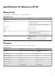 Tabell 8. Specifikationer för den trådlösa modulen Beskrivning Värden Frekvensband som stöds 2,4 GHz/5 GHz Trådlösa standarder ● ● ● ● Kryptering ● 64-bitars/128-bitars WEP ● AES-CCMP ● TKIP Bluetooth Bluetooth 5.1 WiFi 802.11a/b/g Wi-Fi 4 (WiFi 802.11n) Wi-Fi 5 (WiFi 802.11ac) Wi-Fi 6 (WiFi 802.11ax) Ljud I följande tabell visas ljudspecifikationerna för din Alienware m15 R4. Tabell 9.