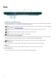 External ports The following table lists the external ports of your Alienware m15 R6. Table 5. External ports Description Values Network port One RJ-45 port USB ports ● Two USB 3.2 Gen 1 ports ● One USB 3.2 Gen 1 port with PowerShare ● One Thunderbolt 4 port with Power Delivery or one USB 3.2 Gen 2 Type-C port with DisplayPort NOTE: You can connect a Dell Docking Station to this port. For more information, see the knowledge base article SLN286158 at www.dell.com/support.