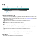 상단 1. 터치패드 터치패드에서 손가락을 움직여 마우스 포인터를 이동시킵니다. 왼쪽 클릭하려면 누르고 오른쪽 클릭하려면 두 손가락으로 누릅 니다. 2. 왼쪽 클릭 영역 왼쪽 클릭과 같은 기능이 수행됩니다. 3. 오른쪽 클릭 영역 오른쪽 클릭과 같은 기능이 수행됩니다. 4. 전원 버튼(Alien 헤드) 꺼져 있거나, 대기 또는 최대 절전 모드에서 누르면 컴퓨터가 켜집니다. 컴퓨터가 켜져 있는 상태에서 누르면 대기 모드로 전환됩니다. 컴퓨터가 켜져 있을 때 전원 버튼을 누르면 컴퓨터가 절전 모드로 전환되고 전원 버튼을 10초 동안 길게 누르면 컴퓨터가 강제 종 료됩니다. 노트: Windows에서 전원 버튼 동작을 사용자 지정할 수 있습니다.