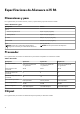 Especificaciones de Alienware m15 R6 Dimensiones y peso En la siguiente tabla, se enumeran la altura, el ancho, la profundidad y el peso de Alienware m15 R6. Tabla 1. Dimensiones y peso Descripción Valores Altura: Altura de la parte frontal 12,90 mm (0,51 pulgadas) Altura posterior 19,20 mm (0,76 pulgadas) Anchura 356,20 mm (14,02 pulgadas) Profundidad 272,50 mm (10,73 pulgadas) Peso NOTA: El peso de la computadora depende de la configuración solicitada y la variabilidad de fabricación.
