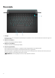 Bovenzijde 1. Touchpad Beweeg uw vinger over de touchpad om de muisaanwijzer te verplaatsen. Tik voor een linkermuisklik en tik met twee vingers voor een rechtermuisklik. 2. Gebied voor linksklikken Indrukken om met de linkermuisknop te klikken. 3. Gebied voor rechtsklikken Indrukken om met de rechtermuisknop te klikken. 4. Aan/uit-knop (Alienhead) Druk op deze knop om de computer in te schakelen als deze is uitgeschakeld of in de slaapstand staat.