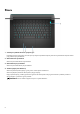 Shora 1. Vícedotyková podložka Precision s podporou gest Pohybujte kurzorem myši pomocí posouvání prstu po dotykové podložce. Klepnutí je kliknutí levým tlačítkem a klepnutí dvěma prsty je kliknutí pravým tlačítkem. 2. Oblast kliknutí levým tlačítkem Stisknutím provedete kliknutí levým tlačítkem. 3. Oblast kliknutí pravým tlačítkem Stisknutím provedete kliknutí pravým tlačítkem. 4. Tlačítko napájení (znak Alienware) Stisknutím počítač zapnete, když je vypnutý nebo v režimu spánku či hibernace.
