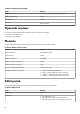 5. táblázat: Külső portok (folytatódik) Leírás Értékek MEGJEGYZÉS: Ehhez a porthoz Dell dokkolóegységet csatlakoztathat. További információkért olvassa el az SLN286158 számú tudásbáziscikket a következő oldalon: www.dell.com/support. Audioport Egy headset- (kombinált fejhallgató- és mikrofon-) port Videoport Egy HDMI 2.