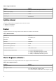 Tablo 5. Harici bağlantı noktaları (devamı) Açıklama Değerler ● Bir adet DisplayPort özellikli USB 3.2 Gen 2 Tip C bağlantı noktası NOT: Bu bağlantı noktasına bir Dell Bağlantı İstasyonu bağlayabilirsiniz. Daha fazla bilgi için şu adresteki SLN286158 kodlu bilgi tabanı makalesine bakın: www.dell.com/support. Ses bağlantı noktası Bir adet kulaklık (kulaklık ve mikrofon kombo) bağlantı noktası Video bağlantı noktası Bir adet HDMI 2.