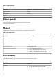 Tabel 5. Port eksternal (lanjutan) Deskripsi Nilai CATATAN: Anda dapat menyambungkan Stasiun Docking Dell ke port ini. Untuk informasi lebih lanjut, lihat artikel basis pengetahuan SLN286158 di www.dell.com/support. Port audio Satu port headset (gabungan headphone dan mikrofon) Port video Satu port HDMI 2.