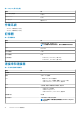 表 11. 鍵盤規格(續) 說明 值 按鍵數目 • • • 大小 X=19.05 mm 鍵距 美國和加拿大:103 鍵 英國:104 鍵 日本:107 鍵 Y= 19.05 mm 鍵距 快捷鍵 鍵盤上的某些按鍵有兩個符號這些鍵可用於輸入替代字元或執行 次要功能。如要輸入替代字元,請按下 Shift 和所需按鍵。如要 執行次要功能,請按下 Fn 和所需按鍵。 註: 您可以定義系統的主要行為的功能鍵 (F1 - F12),進入 BIOS 設定程式變更功能鍵行為。 鍵盤快捷鍵 攝影機 表 12. 攝影機規格 說明 值 攝影機數量 一個攝影機 類型 HD RGB 攝影機 位置 正面相機 感應器類型 CMOS 感應器技術 解析度: 靜態影像 0.92 百萬像素 影像 30 fps (1280 x 720 (HD)) 對角線檢視角度 74.9 度 觸控墊 表 13. 觸控墊規格 說明 值 解析度: 水平 1229 垂直 929 水平 105 mm (4.13 in) 垂直 80 mm (3.15 in.
