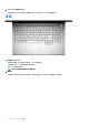 音效 表 9. 音效規格 說明 值 控制器 Realtek ALC3281-CG 立體聲轉換 支援 內部介面 高傳真音效介面 外接式介面 • • 喇叭 2 内置扬声器放大器 支援 外部音量控制 鍵盤快捷鍵控制項 通用音效插孔 HDMI 2.0 連接埠 喇叭輸出: 平均 2W 峰值 2.5 W 超低音喇叭輸出 不支援 麥克風 攝影機組件中的數位陣列麥克風 存放時 您的電腦支援下列其中一種組態: 一個 M.2 2230/2280 固態硬碟 兩個 M.2 2230/2280 固態硬碟 一個 M.2 2230 和一個 M.2 2280 固態硬碟 • • • 電腦的主要磁碟機依儲存裝置組態而有所不同。適用於配備 M.2 磁碟機的電腦,M.2 磁碟機為主要磁碟機 表 10. 儲存裝置規格 儲存類型 介面類型 容量 M.2 2280 固態硬碟 SATA AHCI,最高 6 Gbps 最高 2 TB M.2 2230/2280 固態硬碟 PCIe Gen3.0x4 NVMe,最高 32 Gbps 最高 2 TB 鍵盤 表 11.