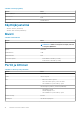 Taulukko 15. Akkutiedot(jatkuu) Kuvaus Arvot Leveys 311,40 mm (12,26 tuumaa) Syvyys 9,90 mm (0,39 tuumaa) Lämpötila-alue: Käytön aikana 0–70 °C (32–158 °F) Tallennuslaitteet -20–60°C (-4–140°F) Käyttöaika Vaihtelee käyttöolosuhteiden mukaan ja voi olla lyhyempi tietyissä virtaa vaativissa olosuhteissa. Latausaika (suunnilleen) 4 tuntia (kun tietokone on sammutettu) HUOMAUTUS: Hallitse latausaikaa, kestoa, aloitus- ja päättymisaikaa ja paljon muuta Dell Power Manager sovelluksella.