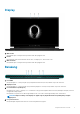 Keyboard Tabel 11. Spesifikasi keyboard Deskripsi Nilai Tipe Keyboard lampu latar RGB Tata letak QWERTY Jumlah tombol • • • Ukuran X= 19,05 mm pitch tombol Amerika Serikat dan Kanada: 103 tombol Kerajaan Inggris: 104 tombol Jepang: 107 tombol Y= 19,05 mm pitch tombol Tombol pintasan Beberapa tombol pada keyboard Anda dibubuhi dua simbol. Tombol-tombol ini dapat digunakan untuk mengetik karakter alternatif atau untuk menjalankan fungsi sekunder.
