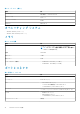 表 5. 外部ポートとコネクタ(続き) 説明 値 ドッキングポート 1 x 外付グラフィックス ディスプレイ ポート メモ: この外付グラフィックス ディスプレイ ポートは、 Alienware Graphics Amplifier と互換性があります。 電源アダプターポート 1 x 7.4 mm x 5.1 mm DC 入力 セキュリティ セキュリティケーブル スロット(ウェッジ型)(1) 表 6. 内部ポートとコネクタ 値 説明 内部: M.2 • • 2230/2280 SATA AHCI/PCIe、NVMe ソリッドステート ドラ イブ用の M.2 スロット(1) 2230/2280 PCIe、NVMe ソリッドステート ドライブ用の M.2 スロット(1) メモ: さまざまなタイプの M.2 カードの機能の詳細につい ては、ナレッジ ベース記事 SLN301626 を参照してくださ い。 通信 イーサネット 表 7.