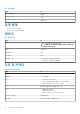 키보드 표 11. 키보드 사양 설명 값 유형 RGB 백라이트 키보드 배치 QWERTY 키 개수 • • • 크기 X=19.05mm 키 피치 미국 및 캐나다: 103키 영국: 키 104개 일본: 키 107개 Y=19.05mm 키 피치 바로 가기 키 키보드의 일부 키에는 2개의 기호가 있습니다. 이러한 키들은 대 체 문자를 입력하거나 보조 기능을 수행하는 데 사용할 수 있습 니다. 대체 문자를 입력하려면, Shift와 함께 원하는 키를 누릅니 다. 보조 기능을 수행하려면, Fn과 함께 원하는 키를 누릅니다. 노트: BIOS 설치 프로그램에서 Function Key Behavior(기 능 키 동작)을 변경하여 기능 키(F1~ F12)의 기본 동작을 정 의할 수 있습니다. 키보드 바로 가기 키 카메라 표 12. 카메라 사양 설명 값 카메라 개수 1개의 카메라 유형 HD RGB 카메라 위치 전면 카메라 센서 유형 CMOS 센서 기술 해상도: 정지 화상 0.