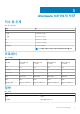 표 3. 칩셋(계속) 설명 값 DRAM 버스 폭 64비트 플래시 EPROM 16MB PCIe 버스 최대 Gen3.0 운영 체제 • • Windows 10 Home(64비트) Windows 10 Professional(64비트) 메모리 표 4. 메모리 사양 설명 값 유형 온보드 시스템 메모리, 듀얼 채널 DDR4 노트: 메모리는 시스템 보드에 내장되어 있으며 구매 후 업 그레이드할 수 없습니다. 속도 2666MHz 최대 메모리 16GB 최소 메모리 8GB 지원되는 구성 • • 8GB DDR4, 2666MHz(2개의 4GB) 16GB DDR4, 2666MHz(2개의 8GB) 포트 및 커넥터 표 5.
