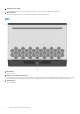 Prawa strona Ilustracja: widok komputera Alienware m17 R2 z prawej strony 1. Porty USB 3.1 pierwszej generacji (2) Służy do podłączania urządzeń peryferyjnych, takich jak urządzenia pamięci masowej i drukarki. Zapewnia szybkość transmisji danych do 5 Gb/s. Podstawa Ilustracja: widok podstawy komputera Alienware m17 R2 1. Przycisk zasilania (głowa obcego) Naciśnij, aby włączyć komputer, jeśli jest wyłączony, w trybie uśpienia lub hibernacji.