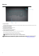 Pohledy na zařízení Alienware m17 R3 Vpravo 1. Slot pro kartu microSD Slouží ke čtení z karty microSD a zápisu na ni. Počítač podporuje následující typy karet: • Karta mSD (Micro Secure Digital) • Karta Micro Secure Digital High Capacity (mSDHC) • Karta Micro Secure Digital Extended Capacity (mSDXC) 2. 2 porty USB 3.1 1. generace Slouží k připojení periferních zařízení (například externího paměťového zařízení nebo tiskárny). Poskytuje rychlost přenosu dat až 5 Gb/s. Vlevo 1.