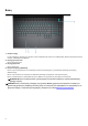 Όψεις του Alienware m17 R3 Δεξιά πλευρά 1. Υποδοχή κάρτας microSD Χρησιμεύει για την ανάγνωση και την εγγραφή στην κάρτα microSD. Ο υπολογιστής υποστηρίζει τους ακόλουθους τύπους καρτών: • Micro Secure Digital (mSD) • Micro Secure Digital High Capacity (mSDHC) • Micro Secure Digital Extended Capacity (mSDXC) 2. Θύρες USB 3.1 Gen 1 (2) Συνδέστε περιφερειακά, όπως εξωτερικές συσκευές αποθήκευσης και εκτυπωτές. Παρέχει ταχύτητες μεταφοράς δεδομένων έως 5 Gbps. Αριστερή πλευρά 1.