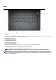 A Alienware m17 R3 számítógép nézetei Jobb 1. microSD-kártyanyílás microSD-kártya olvasása és írása. A számítógép az alábbi kártyatípusokat támogatja: • Micro Secure Digital (microSD) • Micro Secure Digital High Capacity (microSDHC) • Micro Secure Digital Extended Capacity (mSDXC) 2. USB 3.1 Gen 1 portok (2) Csatlakozást biztosít perifériák, például külső adattároló eszközök és nyomtatók számára. Maximum 5 GB/s adatátviteli sebességet biztosít. Bal oldali nézet 1.