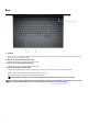 Viste di Alienware m17 R3 Lato destro 1. Slot per scheda microSD Legge da e scrive su scheda microSD. Il computer supporta i seguenti tipi di schede: • Micro Secure Digital (mSD) • Micro Secure Digital High Capacity (mSDHC) • Micro Secure Digital Extended Capacity (mSDXC) 2. Porte USB 3.1 Gen 1 (2) Collegare periferiche come le stampanti e i dispositivi di storage esterni. Offre velocità di trasferimento dei dati fino a 5 Gbps. Lato sinistro 1.