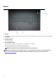 Visninger av Alienware m17 R3 Høyre 1. Spor til microSD-kort Leser fra og skriver til microSD-kortet. Datamaskinen støtter følgende korttyper: • Micro Secure Digital (mSD) • Micro Secure Digital med høy kapasitet (mSDHC) • Micro Secure Digital med utvidet kapasitet (mSDXC) 2. USB 3.1 1. generasjons porter (2) Koble til eksterne enheter som eksterne lagringsenheter og skrivere. Gir dataoverføringshastigheter på opptil 5 Gbps. Venstre 1.