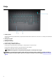 Pogledi računalnika Alienware m17 R3 Desno 1. Reža za kartico microSD Bere s kartice microSD in zapisuje nanjo. Računalnik podpira te vrste kartic: • Kartica microSecure Digital (mSD) • Kartica microSecure Digital High Capacity (mSDHC) • Kartica microSecure Digital Extended Capacity (mSDXC) 2. Vrata USB 3.1 1. generacije (2) Priključite zunanje naprave, kot so zunanje naprave za shranjevanje in tiskalniki. Zagotavlja hitrosti prenosa podatkov do 5 Gb/s. Levo 1.