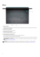 Pohledy na zařízení Alienware m17 R4 Vpravo 1. Slot pro kartu microSD Slouží ke čtení z karty microSD a zápisu na ni. Počítač podporuje následující typy karet: ● Karta mSD (Micro Secure Digital) ● Karta Micro Secure Digital High Capacity (mSDHC) ● Karta Micro Secure Digital Extended Capacity (mSDXC) 2. 2 porty USB 3.2 1. generace Slouží k připojení zařízení, jako jsou externí úložiště nebo tiskárny. Poskytuje rychlost přenosu dat až 5 Gb/s. Vlevo 1.