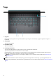 Visninger av Alienware m17 R4 Høyre 1. microSD-kortspor Leser fra og skriver til microSD-kortet. Datamaskinen støtter følgende korttyper: ● Micro Secure Digital (mSD) ● Micro Secure Digital med høykapasitet (mSDHC) ● Micro Secure Digital med utvidet kapasitet (mSDXC) 2. 1. generasjons USB 3.2-porter (2) Koble til enheter slik som eksterne lagringsenheter og skrivere. Gir dataoverføringshastigheter på opptil 5 Gbps. Venstre 1.