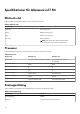 Specifikationer för Alienware m17 R4 Mått och vikt I följande tabell visas höjd, bredd, djup och vikt för din Alienware m17 R4. Tabell 1. Mått och vikt Beskrivning Värden Höjd (max) 22 mm (0,87 tum) Bredd 399,80 mm (15,74 tum) Djup 294,30 mm (11,59 tum) Vikt (max) 2,97 kg (6,55 lb) OBS: Vikten på din dator beror på den beställda konfigurationen och variationer i tillverkningen. Processor I följande tabell finns information om de processorer som stöds av din Alienware m17 R4. Tabell 2.