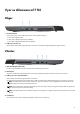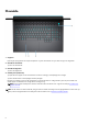 Vyer av Alienware m17 R4 Höger 1. microSD-kortplats Läser från och skriver till microSD-kortet. Datorn stöder följande korttyper: ● Micro Secure Digital (mSD) ● Micro Secure Digital High Capacity (mSDHC) ● Micro Secure Digital Extended Capacity (mSDXC) 2. USB 3.2-portar Gen 1 (2) Anslut enheter såsom externa lagringsenheter och skrivare. Ger dataöverföringshastigheter på upp till 5 Gbit/s. Vänster 1.