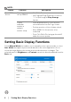 NOTE: Feature Quick DDM Access Function Description Quick key to call up DDM UI • Ctrl+Shift+D Control individual monitor in multiple monitor setup • From dropdown box to select monitor, selected monitor has Dell logo shown. • Use Page Up/Page Down key or click on “>” to flip through all Easy Arrange layouts. • Perform monitor self-test feature check. • Move DDM UI to the monitor to be controlled. • Press Ctrl+Shift+D to bring up the miniUI under the mouse pointer.