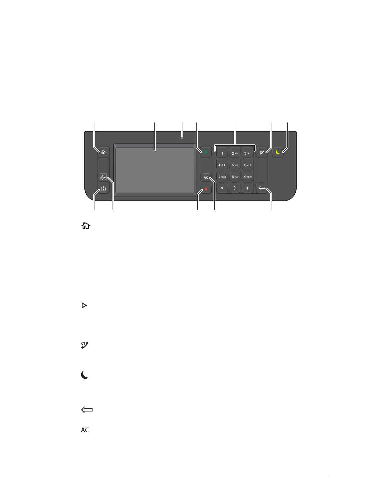Operatørpanelet har et berøringspanel, en status-LED, kontrollknapper og et talltastatur, alt for å betjene skriveren.