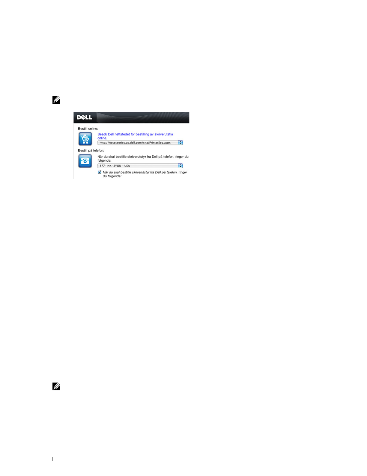 Viser en liste over tilgjengelige URL-er der du kan bestille utstyr til Dell-skrivere.