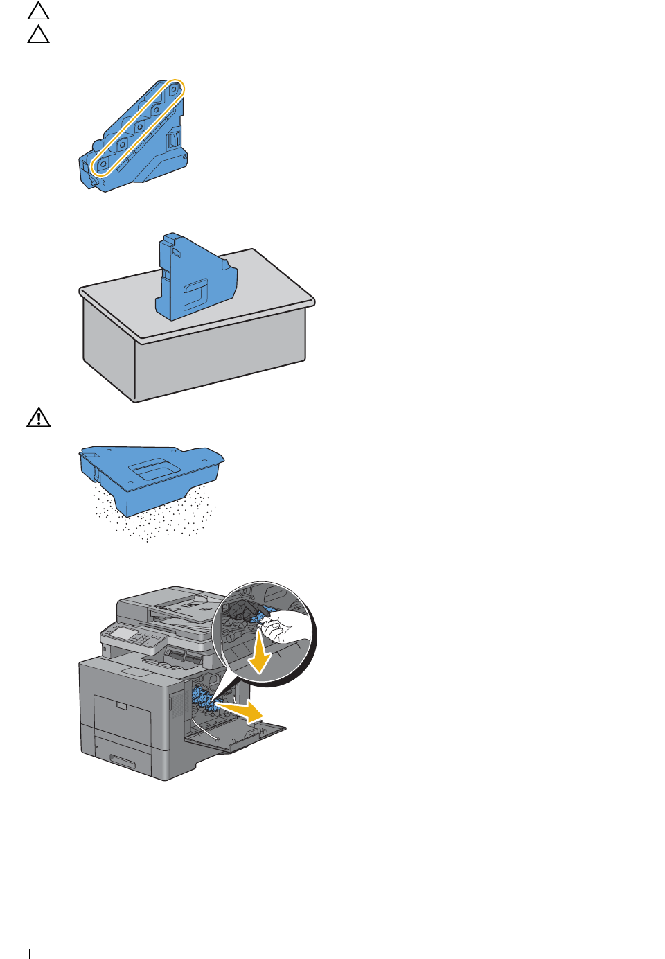 ADVARSEL: La aldri resttonerboksen ligge på siden. Det kan føre til at funksjonsfeil eller tonersøl.