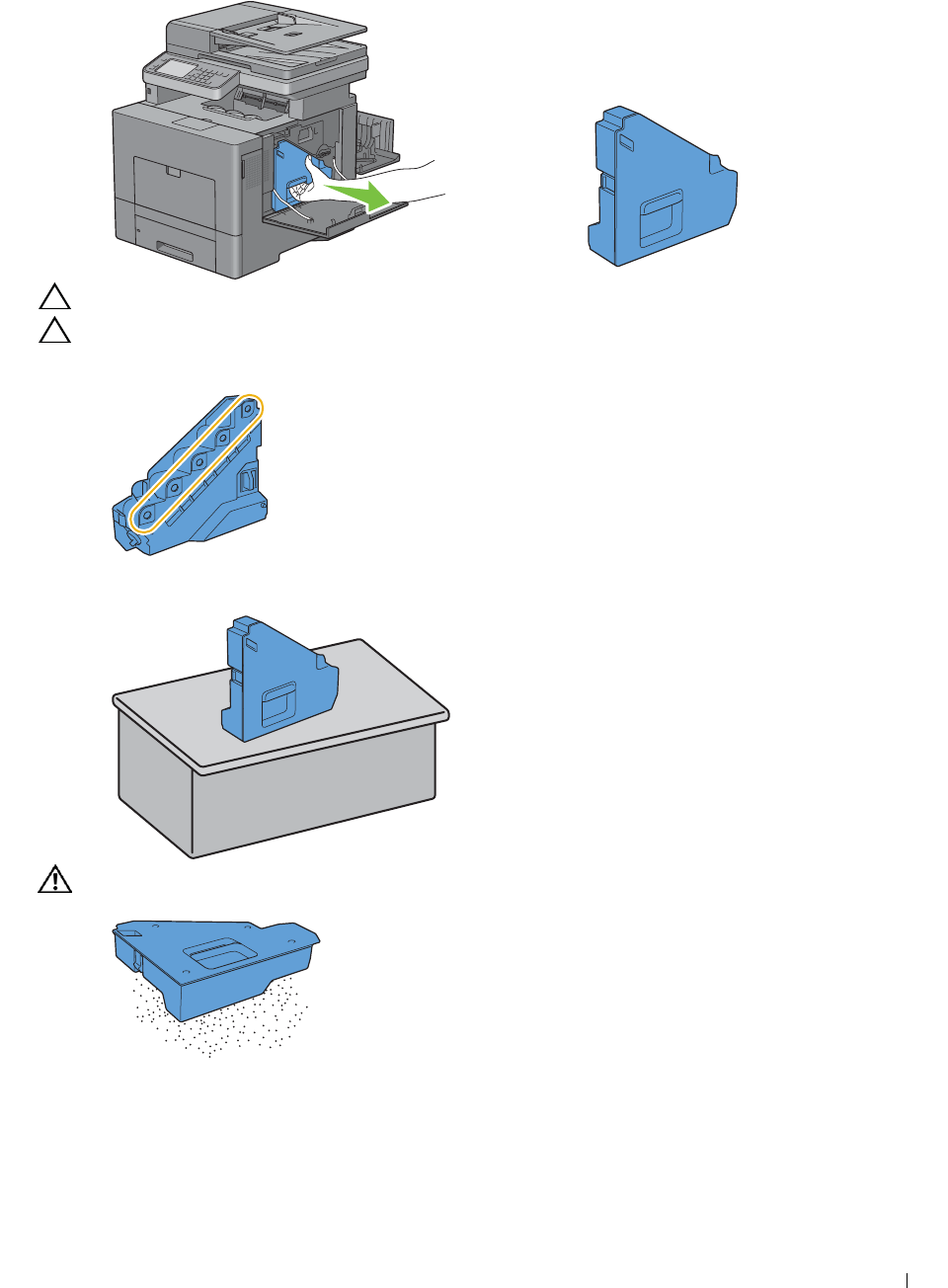 FORSIKTIG: Vær forsiktig så du ikke mister resttonerboksen mens du tar den ut.