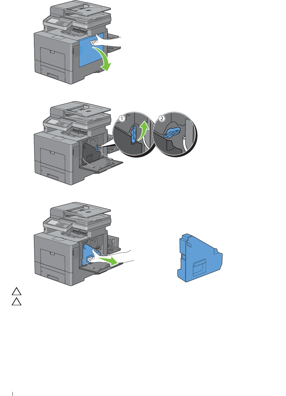 Grip om håndtaket på resttonerboksen, trekk den ut og hold den opp-ned slik at resttoneren ikke søles ut.