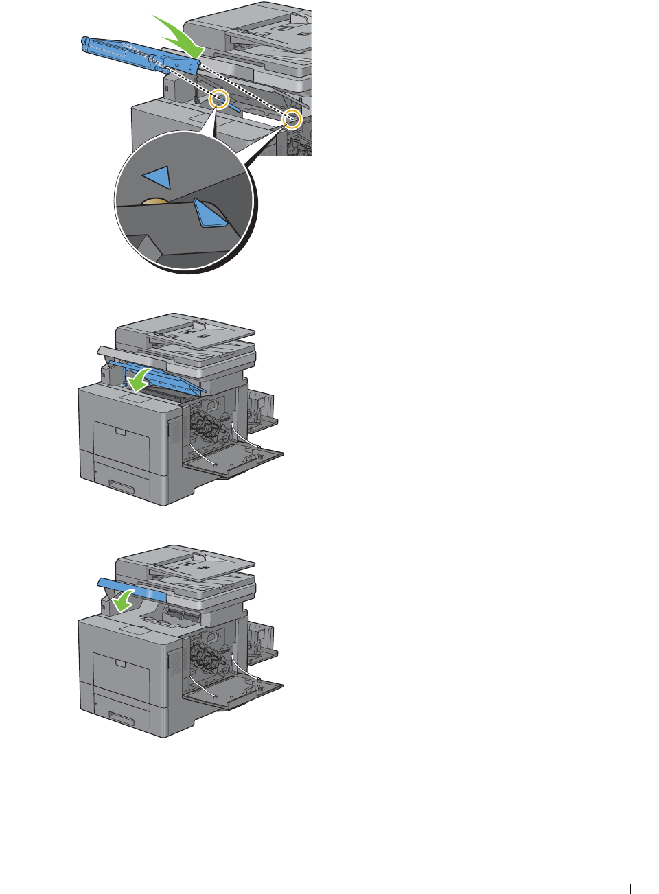 Sørg for at pilmerkene på belteenheten og på skriveren står mot hverandre, og sett deretter enheten inn i skriveren