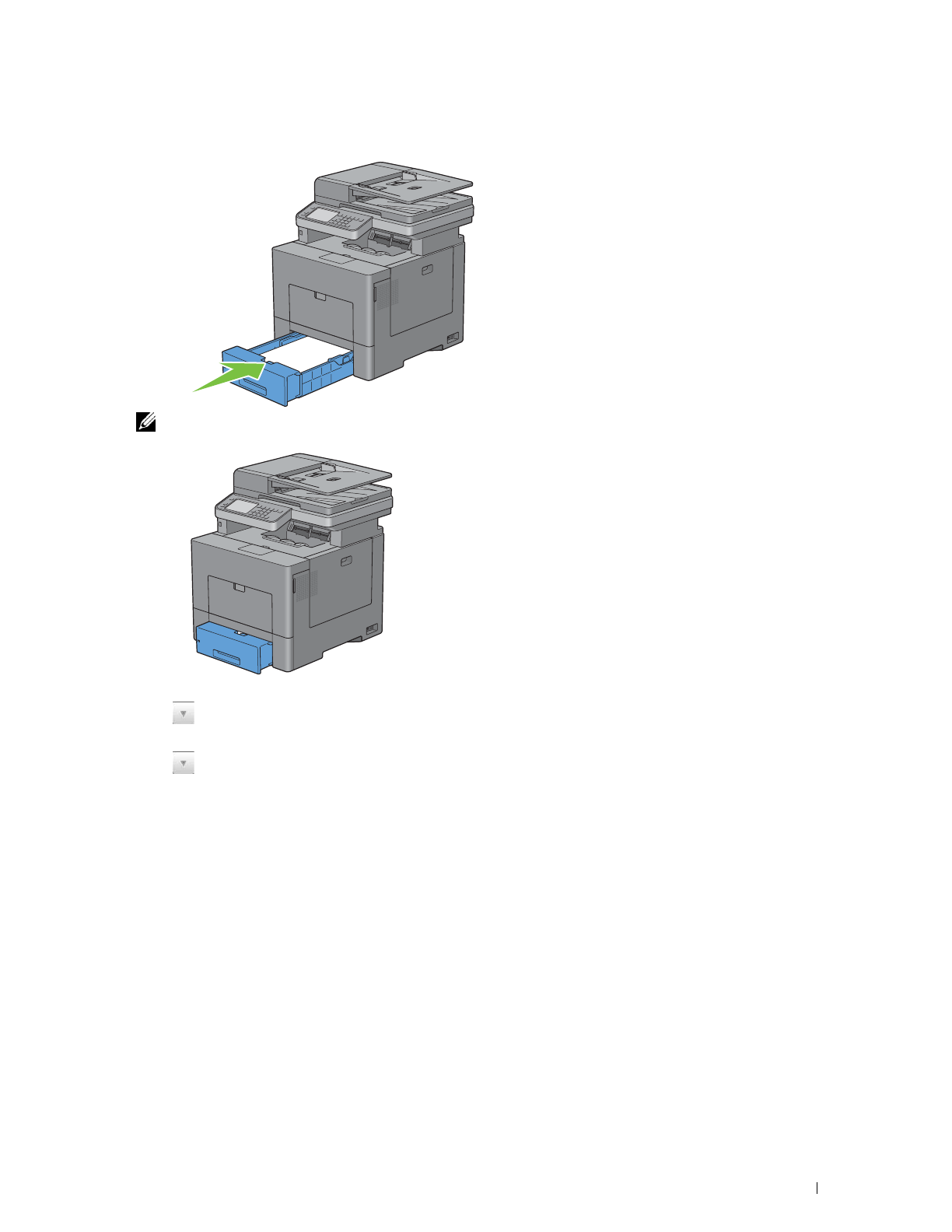 MERK: Dersom forsiden av skuffen er utvidet, vil skuffen stikke ut når den er satt inn i skriveren.