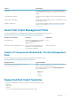 Feature Functionality Monitoring Supports health monitoring for Dell client systems and instance level health information for processors, OMCI service, sensors, and storage. Launching Remote Desktop Launches the remote desktop for client systems through OpsMgr console. Client Shutdown and Reboot Supports the shutdown and reboot tasks for the Dell client systems through OpsMgr console. Hardware Health roll up Provides the client hardware health roll up to Widows Computer Health.