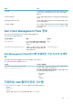 표 5. Dell 개체 검색 검색 개체 설명 Dell 관리형 클라이언트 그룹 개체군 검색 Dell 비즈니스 클라이언트의 지원되는 모든 모델을 사용하여 Dell 관리형 그룹을 검색합니다. Dell 클라이언트 검색 지원되는 Dell 제품 설명서가 있는 Dell 비즈니스 클라이언트의 지 원되는 모든 모델을 검색합니다. Dell 클라이언트용 하드웨어 구성 요소 검색 프로세서, 센서 및 스토리지를 포함하는 모든 Dell 클라이언트 구 성 요소를 검색합니다. 서비스 검색 Dell OpenManage Client Instrumentation Service를 검색합니다. Dell 하드웨어 그룹 개체군 검색 Dell 클라이언트 그룹의 Dell 하드웨어 그룹을 검색합니다.