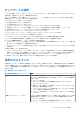 アップデートの選択 [ようこそ]画面で、[チェック]をクリックして、[アップデートのチェック]タスクを実行します。システムのアップデートが ある場合は、[選択したアップデート]画面が表示されます。 アップデートの概要は、見出しの横に update type 表示形式(メガバイト(MB)単位)で表示されます。 重要度に基づいて、アップデートは次のように説明されます。 ● ● ● ● ● ● ● ● 「x」はダウンロードするアップデートの数です。 「y」は使用できるアップデートの合計数です。 「z」は使用できるアップデートのサイズです。 [セキュリティアップデート] - これらのアップデートは、システムのセキュリティを向上させます。 [重要なアップデート] — システムの信頼性、セキュリティ、および可用性の向上のために重要なアップデートです。 [推奨されるアップデート] — システムにインストールすることが推奨されるアップデートです。 [オプションのアップデート] — これらはオプションのアップデートです。 [Dell ドッキング ソリューション] - これらのアップデートは De