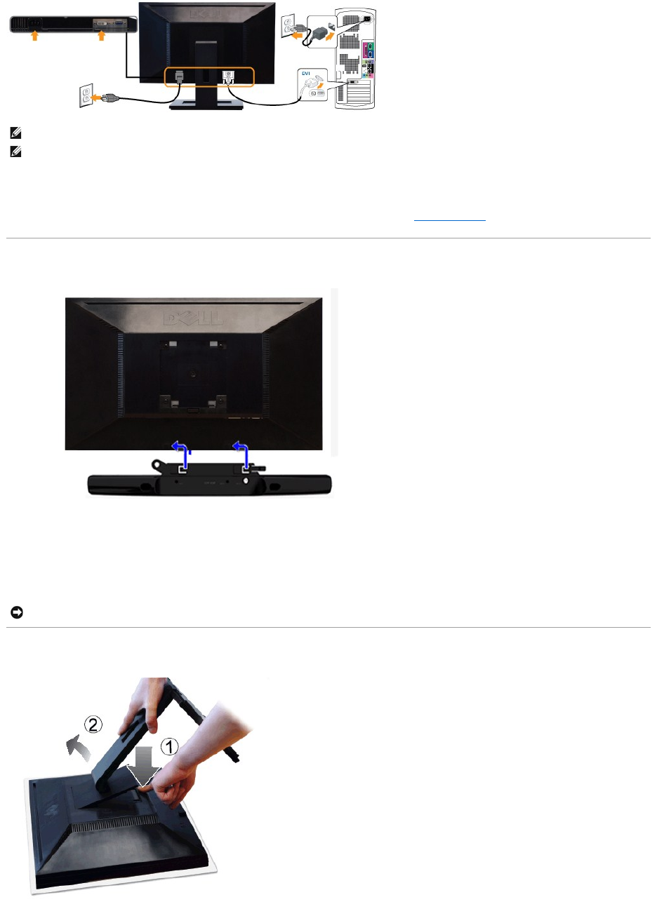 Working from the rear of the monitor, attach the Soundbar by aligning the two slots with the two tabs along the bottom rear of the monitor.