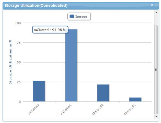 This report provides storage utilization as a percentage of allocated storage for clusters.