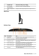 Parts and Controls Front View ew Label 1 2 Side-panel controls Description Function buttons (For more information, see Operating the Monitor) Power On/Off button (with indicator light) Back View Label 1 2 3 Description 100 mm x 100 mm VESA mounting holes (under VESA cover) Regulatory label Stand release button 8 About Your Monitor Use Wall mount monitor using 100 mm x 100 mm VESA-compatible wall-mount kit. Lists the regulatory approvals. Releases the stand from the monitor.