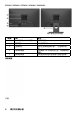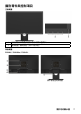 顯示器操作 開啟顯示器電源 按下 按鈕即可啟動顯示器。 使用前面板控制項目 使用顯示器前方的按鈕(位於顯示器前方),調整影像設定。 前面板按鍵 說明 使用預設模式按鍵,在預設色彩模式中進行選擇。請參 閱使用螢幕顯示 (OSD) 功能表。 A 預設模式 使用亮度 對比度按鍵直接進入「亮度」與「對比度」 控制功能表。 B 亮度 對比度 使用功能表按鍵開啟螢幕顯示 (OSD)。 C 功能表 使用離開按鍵,結束功能表與子功能表的螢幕顯示 (OSD)。 D 離開 前面板按鍵 前面板按鍵 說明 使用向上按鍵調整(增加範圍) OSD 功能表中的項目。 A 向上 26 顯示器操作