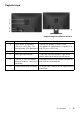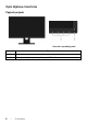Opis dijelova i kontrola Pogled sprijeda Kontrole na prednjoj ploči Oznaka 8 Opis 1 Funkcijske tipke (za dodatne informacije pogledajte Korištenje monitora) 2 Gumb za uključivanje i isključivanje (s LED indikatorom) | O monitoru